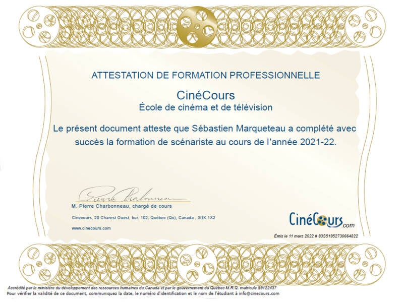 Afin de compléter son activité, il a suivi des cours de scénariste auprès de Cinécours et a validé sa formation en janvier 2022.